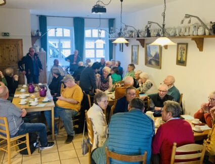 Während der Reparatur vertreiben sich die Gäste, gegen einen kleinen Obolus, bei Kaffee / Tee und selbst gebackenem, leckeren Kuchen und Gesprächen die Zeit.