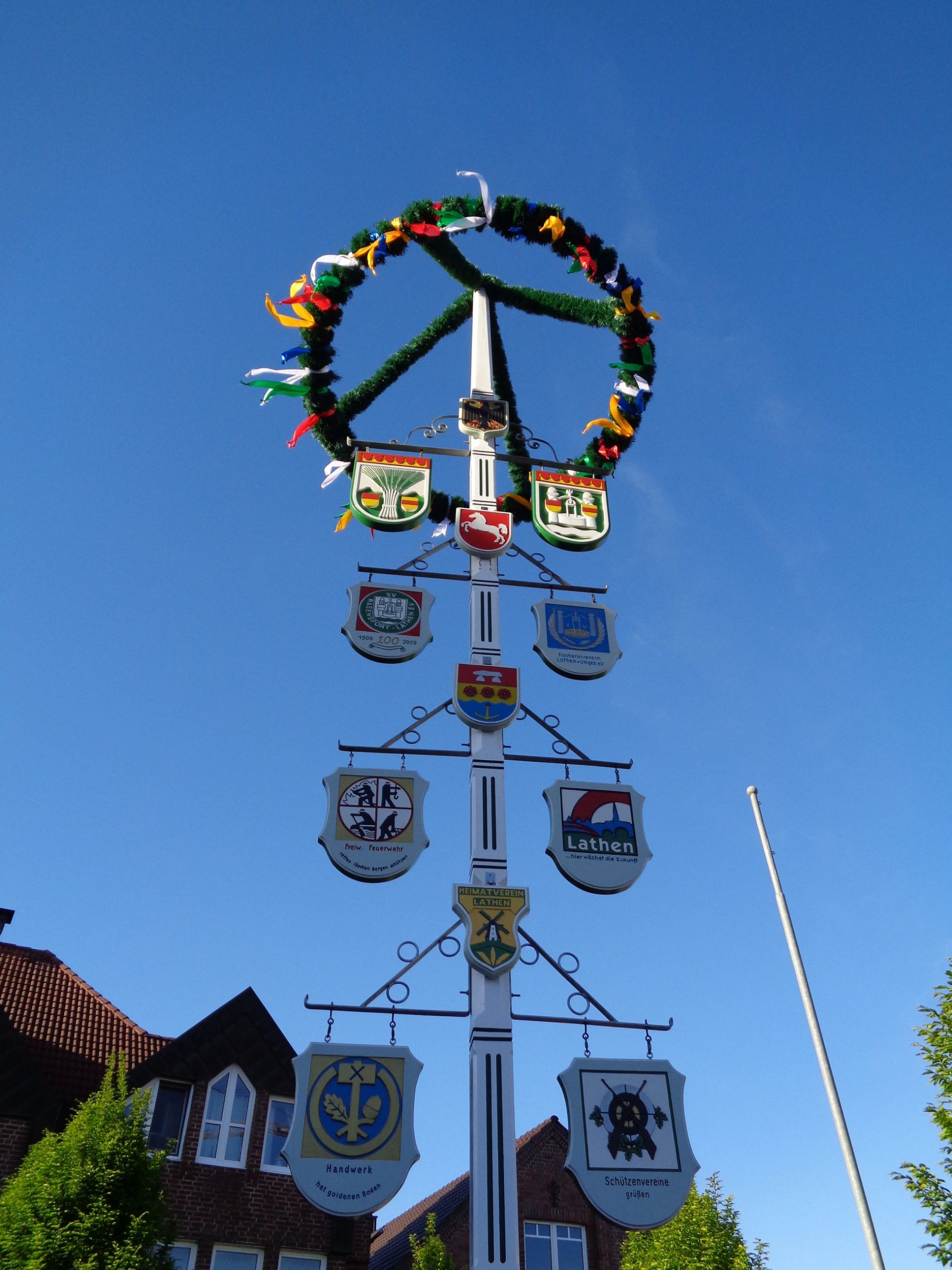 Wie in jedem Jahr, stellen wir am 30. April ab 17.00 Uhr den Maibaum am Lathener Marktbrunnen auf. Der Baum wurde von Mitgliedern unseres Heimatvereins liebevoll mit den Wappen der örtlichen Lathener Vereine, des Handwerks, der