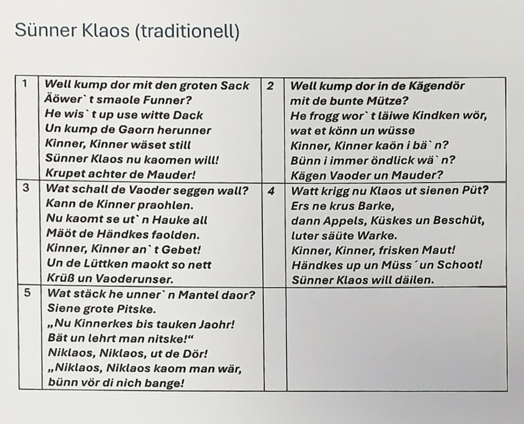 Dann müss hej wieder un wi habt üm mit plattdütske Läier verabschieden daon. Maria ha noch äin Wiehnachts-Läid up Laoger, wat sej in de Schaule lehrt ha. “Sünner Klaos” will dat Läid unbedingt tauken Jaohr hörn! Dat häit: hej kump wal wär!