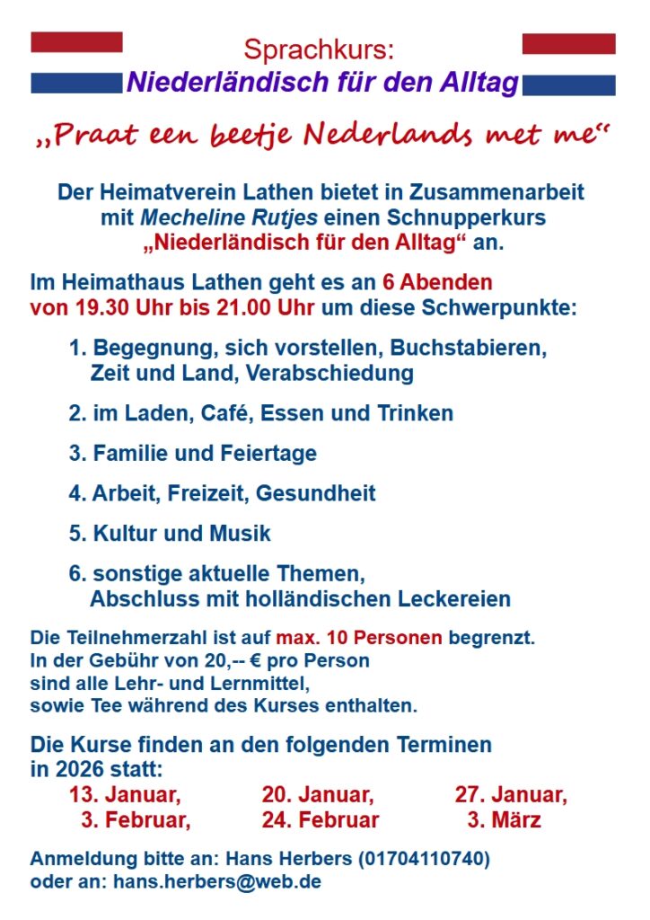 Der Heimatverein bietet in Zusammenarbeit mit Mecheline Rutjes einen Schnupperkurs “Niederländisch für den Alltag” an. Unter dem Motto “Praat een beetje Nederlands met me” findet an 6 Abenden im Heimathaus in der Zeit von 19.30 Uhr bis 21.00 Uhr ein Sprachkurs mit 6 Schwerpunkten (s.u.) statt.