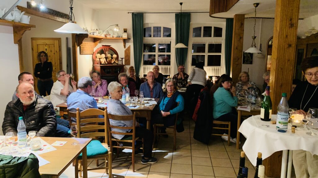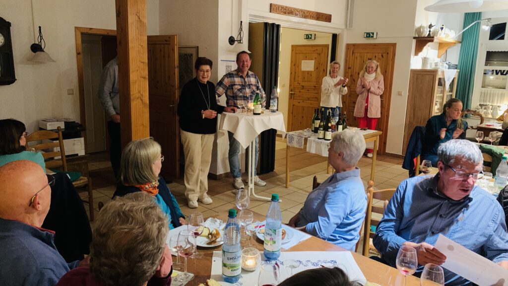 Zum 9. Oktober 2025 Hatte der Heimatverein (HV) Lathen die Familie Hoffmann gebeten, eine Weinprobe im Heimathaus zu veranstalten. Alle Plätze dafür waren schnell vergeben! Insgesamt elf verschiedene Weine des renommierten Weingutes “Anselmann” aus Edesheim, in weiß, rosé und rot, in lieblich, feinherb, halbtrocken und trocken wurden den Gästen der Weinprobe zur Verkostung vorgestellt. Und alle fanden ihre Liebhaber! Die Vielfalt der Weine war sehr ausgewogen. Erlesene und erfrischende Weißweine, süffiger Roséwein und gehaltvolle Rotweine mit schönen, mehr oder minder kräftigen Aromen, wurden präsentiert.